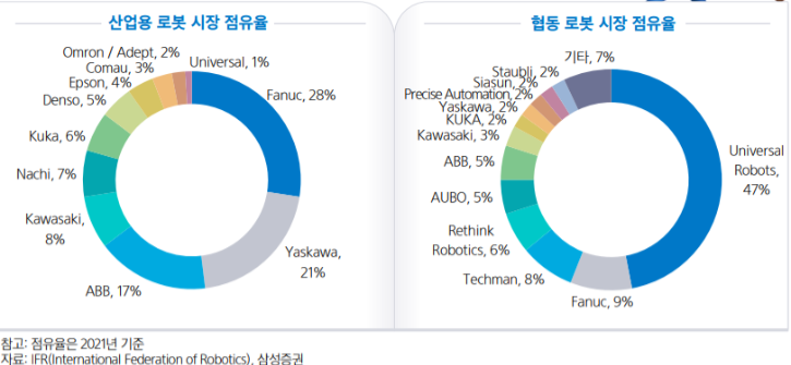 - 글로벌 로봇산업의 강자는 일본이다. 일본은 1960년대 후반부터 인력 부족 문제를 해결하기 위해 로봇산업을 육성하였으며, 현재 글로벌 산업용 로봇 점유율의 50% 가까이 차지하고 있다. 2000년대 이후 미국과 한국 등 여러 국가가 협동로봇 분야에 진출하면서 일본 점유율은 낮아지고 있으나, 여전히 글로벌 로봇산업의 선두주자라고 할 수 있다. 일본 로봇산업 대표 업체는 '화낙(Fanuc, 협동로봇 제작 및 판매)', '야스카와전기(Yaskawa, 산업용 로봇 제조)' 등이 있고, 로봇이 움직이는데 중요한 감속기(로봇의 관절 역할)를 생산하는 '하모닉드라이브시스템즈(HDS, 감속기 생산)', 공장 자동화 센서 제조 기업인 '키엔스(Keyence, 자동화 센서 및 측정기 생산)' 등이 있다. 그래서 로봇업체들의 매출액 흐름을 볼 때에는 일본 공작기계와 로봇수주 지표를 보는 것이 중요하다. 일본 공작기계 수주 증감율 추이를 보면 24~31개월 주기로 싸이클이 이어졌는데 해당 싸이클이 반복된다면 23년 하반기 경에 반등할 가능성이 높다.