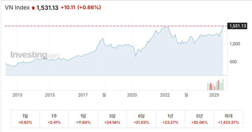 이후 오랜 기간동안 횡보세를 이어가던 베트남 증시는 2025년 다시 살아나고 있다. 2025년 7월 베트남 VN 지수는 1530 포인트를 돌파하며 사상 최고치를 경신했고, 글로벌 투자 자금 또한 다시 베트남으로 유입되고 있다. 대체 왜 그럴까? 이번 글에서는 베트남 주식 시장의 대표 지수인 VN 지수에 대한 소개와 상승 이유, 그리고 베트남 우량주에 투자할 수 있는 미국 상장 ETF인 VNM(VanEck Vietnam ETF)에 대해 소개하고자 한다.